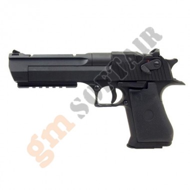 Desert Eagle elettrica. Carrello in metallo, fusto in polimero. Colpo sigolo e raffica. Slitta sotto canna. Peso 1,2 Kg. Lunghezza 28 cm. Caricatore da 24 bb. Prodotto Low Cost/Giocattolo (non adatta per uso agonistico). Batteria e carica compresi nella confezione (non coperti da garanzia).
