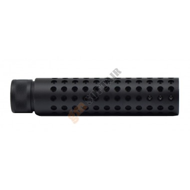 PTS MK18SD Mock Suppressor. Dimensioni 170 x 40 mm. Filettatura 14x1 mm sinistra. Silenziatore in alluminio, spegnifiamma in lega di acciaio. Sistema di bloccaggio a cricchetto per spegnifiamma PTS 51T e/o Battlecomp 51.0. Replica fedele del silenziatore in dotazione al reparto US Navy Seal.