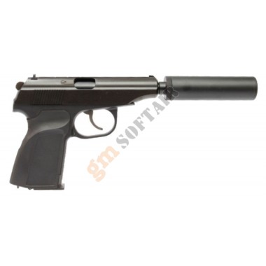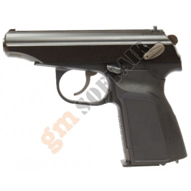 Makarov WE. Loghi originali. Funzionamento a gas scarrellante. Completamente in metallo. Silenziatore incluso. Lunghezza 165mm. Peso 620g. Caricatore da 16bb. Hop up regolabile.