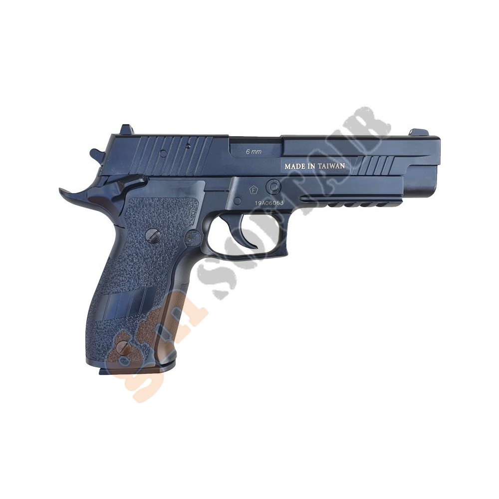 Blackwater SIG X-Five. Funzionamento a CO2 scarrellante. Guscio e carrello in metallo. Hop Up regolabile. Slitta weaver sotto canna per aggancio accessori. Lunghezza 225mm. Peso 1137g. Caricatore da 24bb.