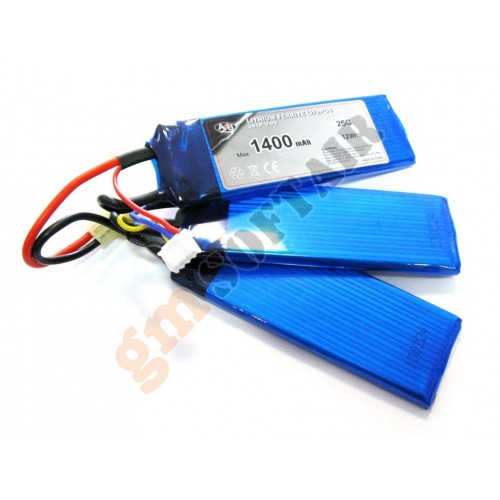 Batteria LiFe PO4 9.9V x 1400mAh 25C.Dimensioni: 100x35x6mm (x3).Necessita di carica batterie dedicato.