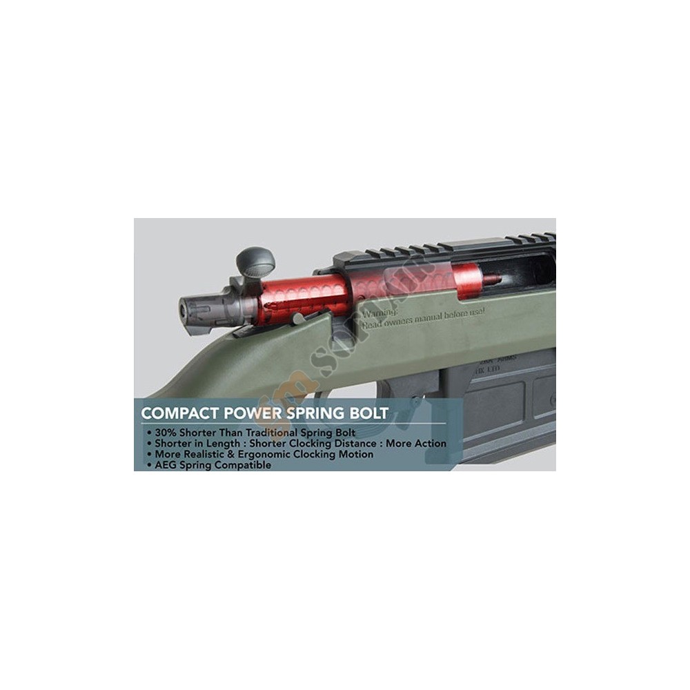 MOD 24 Modify-Tech. Funzionamento bolt action a molla. Calciatura in fibra e canna in metallo. Hop Up regolabile e caricatore per pallini traccianti! Slitta picatinny per ottica. Grilletto regolabile.