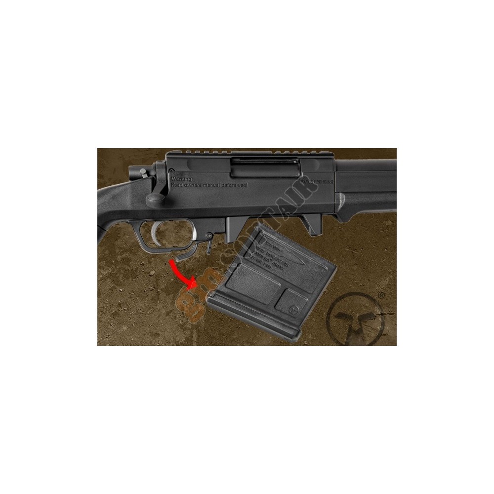 VSR10 G-Spec Well. Funzionamento bolt action a molla. Calciatura in ABS. Canna e gruppo di scatto in metallo. Slitta porta ottica compresa. Ottica 3-9x40. Bipiede. Lunghezza 900mm. Canna interna 300mm. Peso 2700g. Caricatore da 25bb.