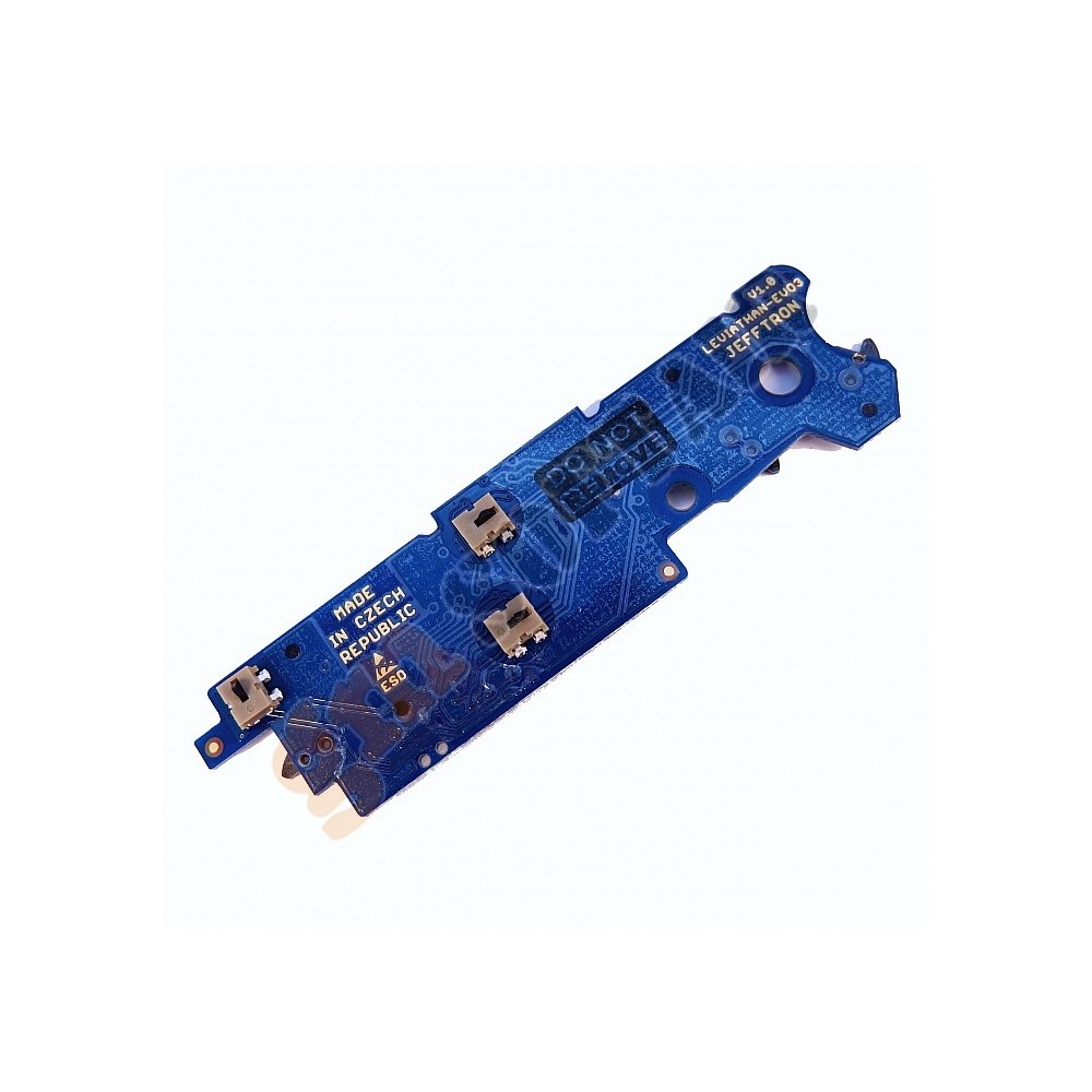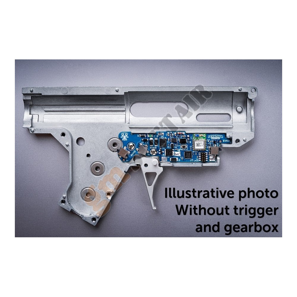 Leviathan - EVO3 è un mosfet controllato da processore con comunicazione wireless. Aggiunge nuove modalità di tiro, controlla RoF, pre-cocking, frenata attiva, indicazione di batteria scarica, statistiche ... Tutto è controllato tramite l'applicazione da smartphone (iOS e Android). Il dispositivo è completamente integrato nella versione del gearbox EVO 3 A1 al posto dell'elettronica originale. Mantiene tutte le funzioni dell'elettronica originale: rilevamento del caricatore vuoto, bolt catch, ecc. Viene fornito con cavi completamente realizzati nella parte anteriore con connettore DeanT: nessuna saldatura necessaria.