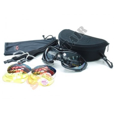 Occhiali multiuso Glory. Nascono per un uso militare, law enforcement e sportivo. Standard ANSI Z87.1 ed EN166. Montatura in polimero stampato ad iniezione, stanghette regolabili in lunghezza. Lenti in policarbonato ad alta resistenza con spessore di 2mm. Provvisto di 3 lenti: Bianca, Grigia e Gialla. Laccio in neoprene e sacchetto in microfibra.