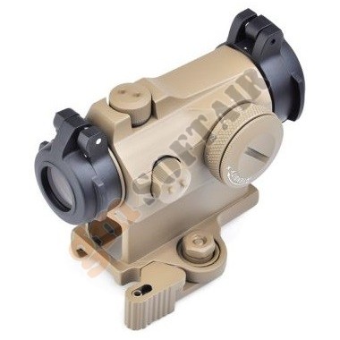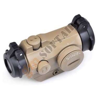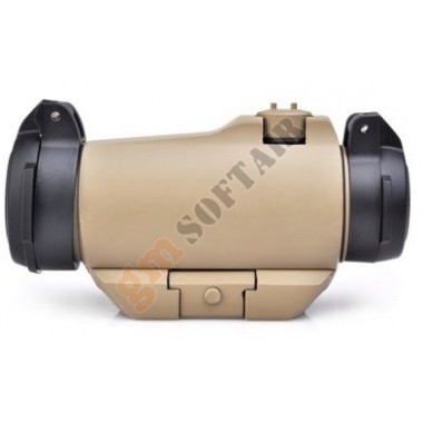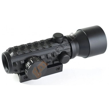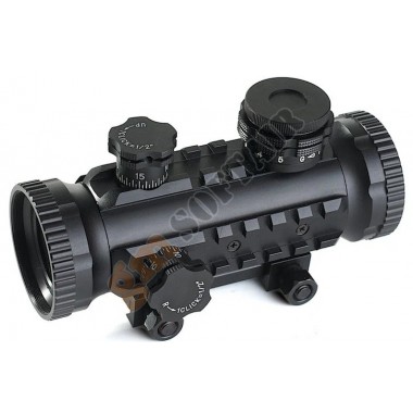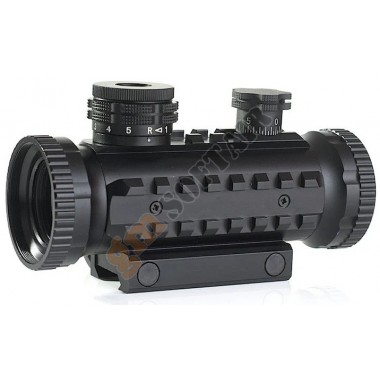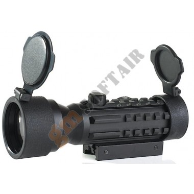 Red Dot AIM-O. Colore del punto rosso/verde a 2 livelli di intensità. Realizzato in alluminio. Sistema di aggancio per slitte Picatinny. Diametro 30mm. Lunghezza 130mm. Alzo e deriva regolabili. Compreso di tappi per lente flip-up. Funzionamento con 2 batterie LR44 , non incluse.