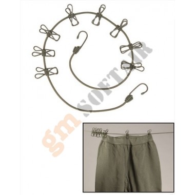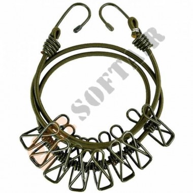 Corda Stendi Abiti Mil-Tec. Elasticizzata, con mollette e ragni per potere essere tesa in qualunque posto. Lunghezza 110 cm.