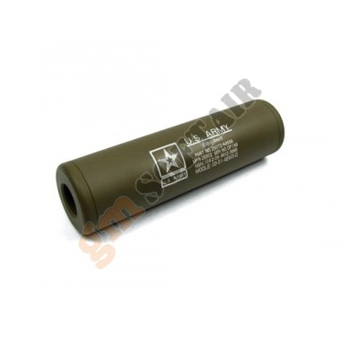 Silenziatore 110X30mm con Logo US Army King Arms. Con passo 14.1 destro e sinistro. Colore Desert.