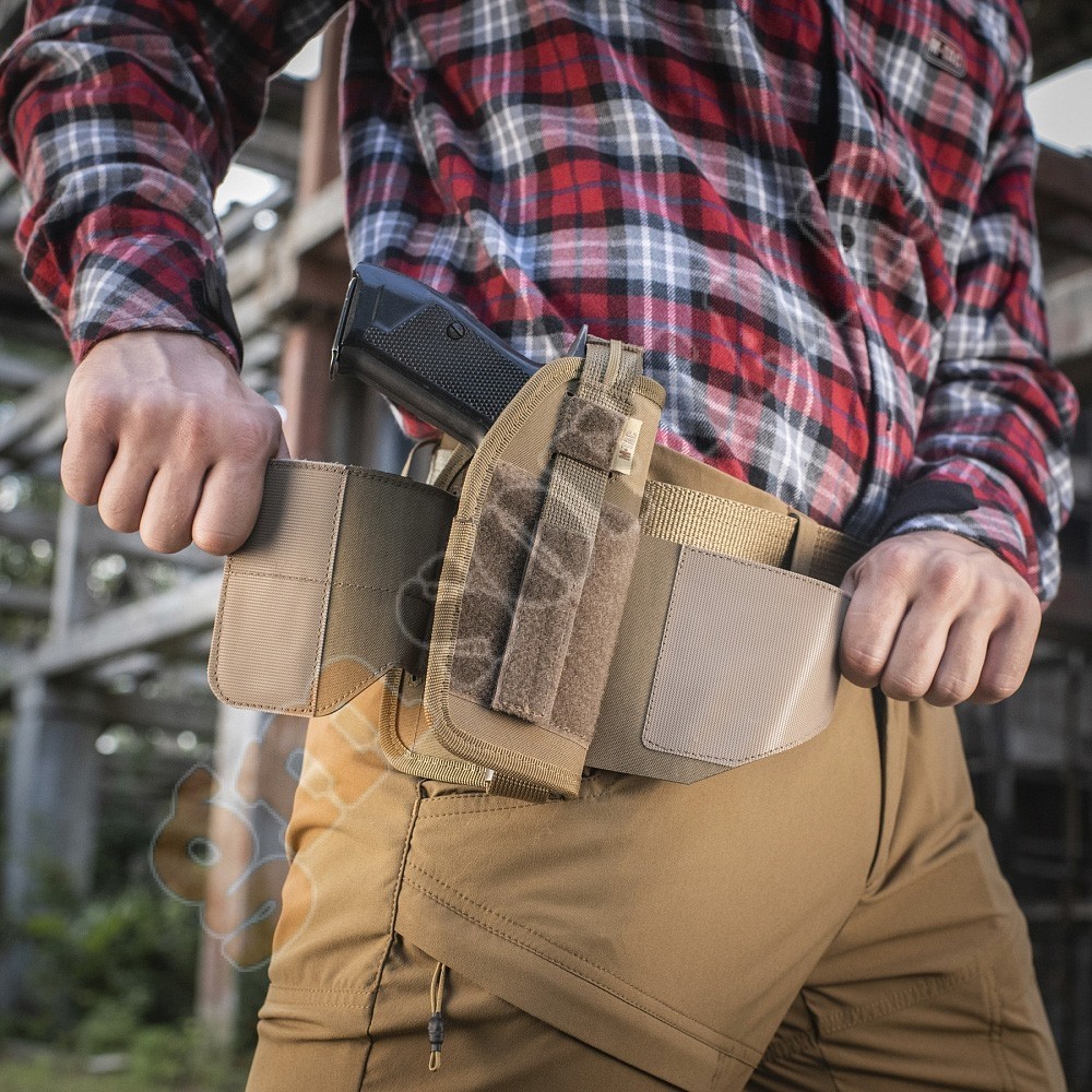 La pistola in fondina è fissata tramite una cinghia regolabile con bottone del marchio mondiale YKK e gancio in velcro.