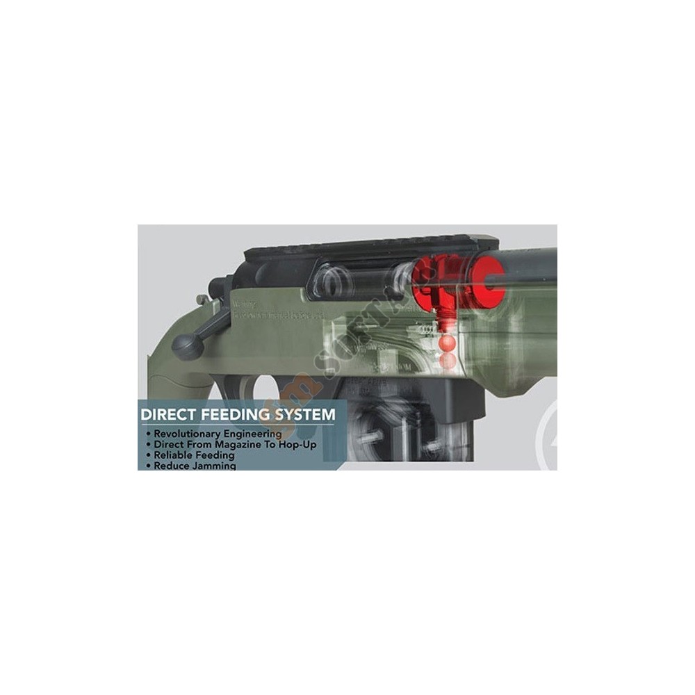 MOD 24 Modify-Tech. Funzionamento bolt action a molla. Calciatura in fibra e canna in metallo. Hop Up regolabile e caricatore per pallini traccianti! Slitta picatinny per ottica. Grilletto regolabile.
