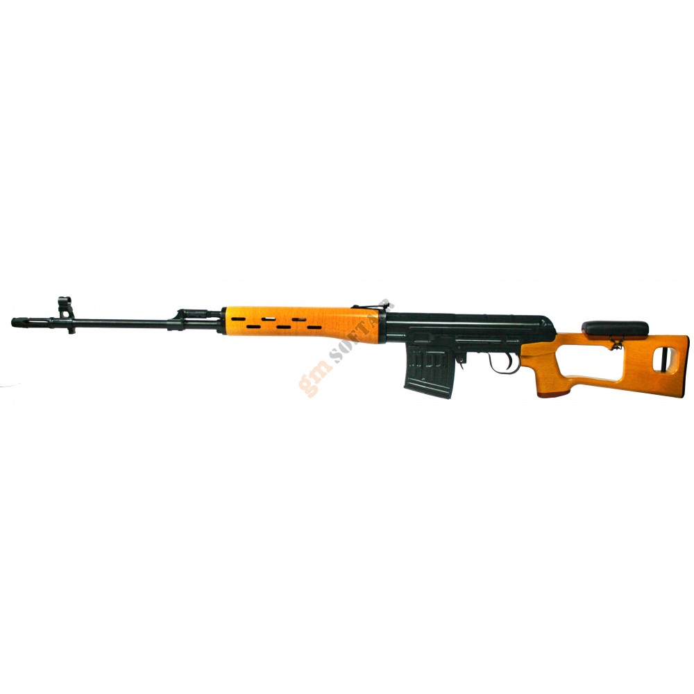 Dragunov SVD Cyma. Funzionamento elettrico, a colpo singolo. Guscio in metallo, con calcio e paramano in legno. Supporto laterale per slitta porta ottica.Batteria e carica compresi nella confezione (non coperti da garanzia).