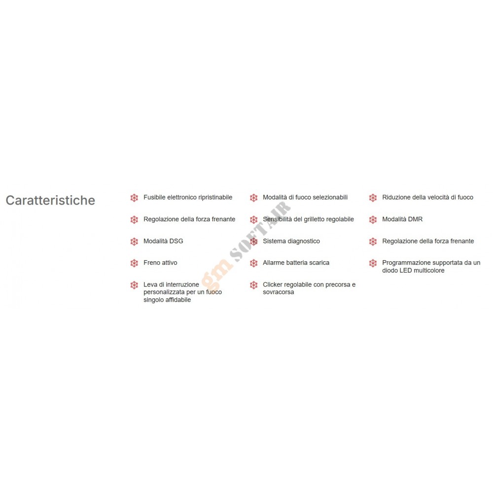il grilletto può essere impostato su 8 livelli di sensibilità sia per il primo che per il secondo stadio, da una breve pressione necessaria per sparare un colpo a una lunga. Non è necessaria alcuna modifica al grilletto o al gearbox e la regolazione della sensibilità del grilletto è possibile anche sul campo.
