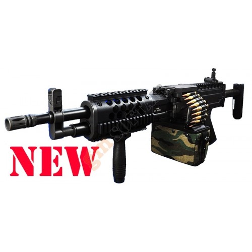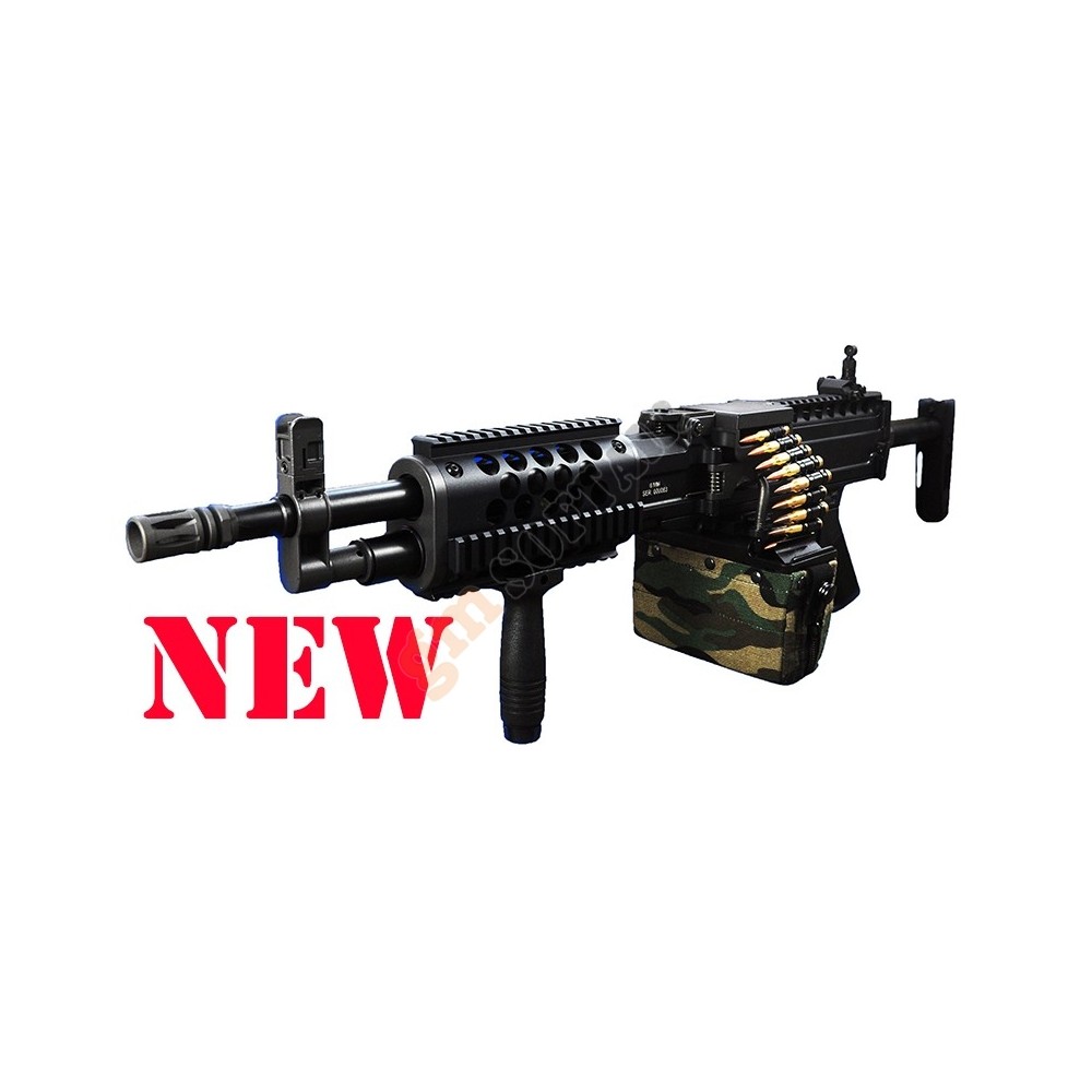 LMG Elettrica Versione 2020 Ares. Full metal. Calcio rimovibile ed estensibile in 6 posizioni. Grip inclusa. Tacca di mira posteriore flip up. Sicura e full auto (no colpo singolo). Hop up regolabile. Sistema rapido di sgancio canna.Batteria e carica batteria opzionali.