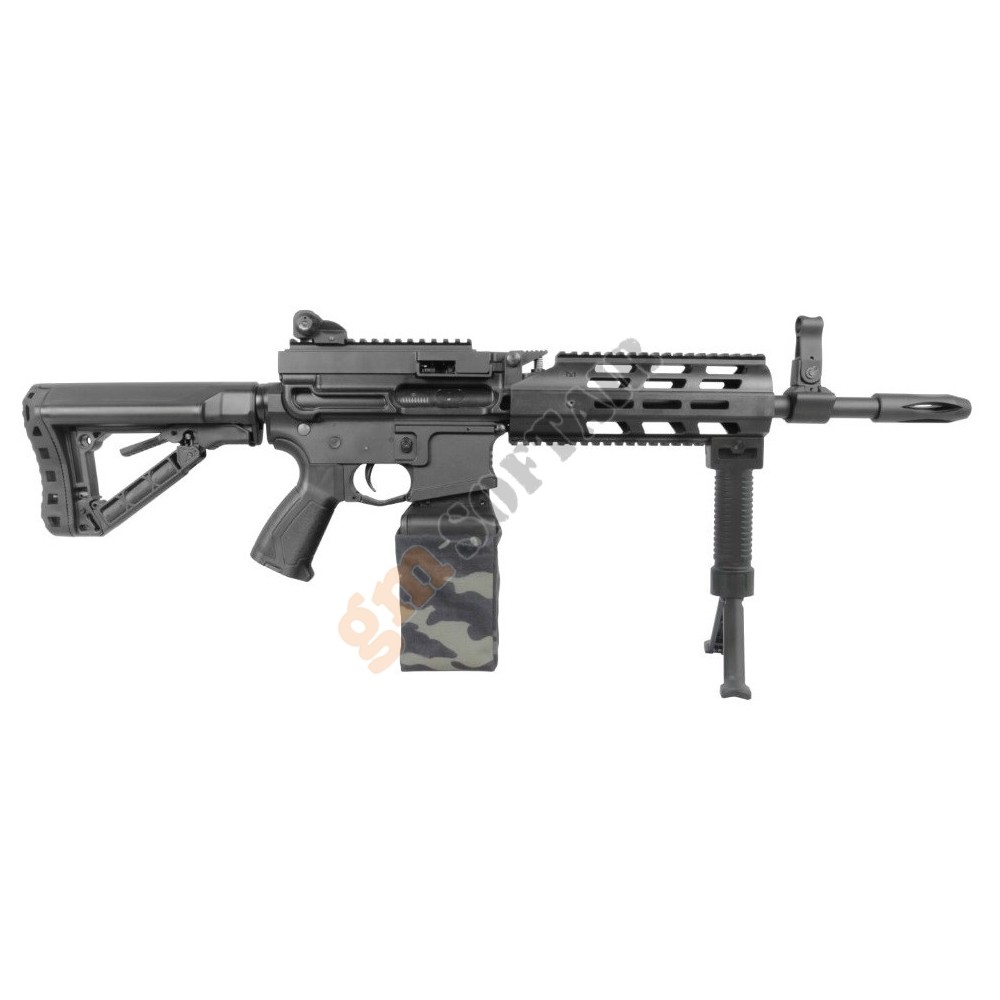 LMG Elettrica Versione 2020 Ares. Full metal. Calcio rimovibile ed estensibile in 6 posizioni. Grip inclusa. Tacca di mira posteriore flip up. Sicura e full auto (no colpo singolo). Hop up regolabile. Sistema rapido di sgancio canna.Batteria e carica batteria opzionali.