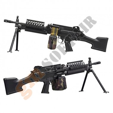 LMG Elettrica Versione 2020 Ares. Full metal. Calcio rimovibile ed estensibile in 6 posizioni. Grip inclusa. Tacca di mira posteriore flip up. Sicura e full auto (no colpo singolo). Hop up regolabile. Sistema rapido di sgancio canna.Batteria e carica batteria opzionali.