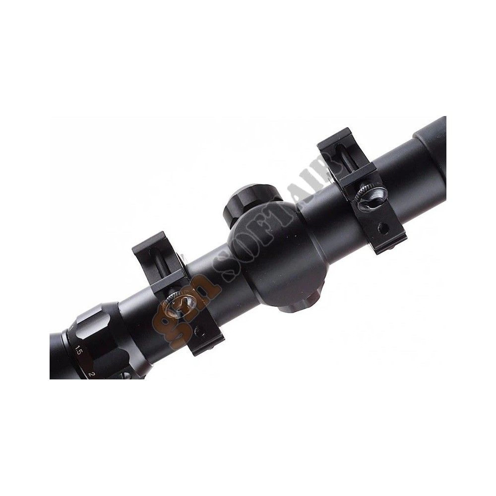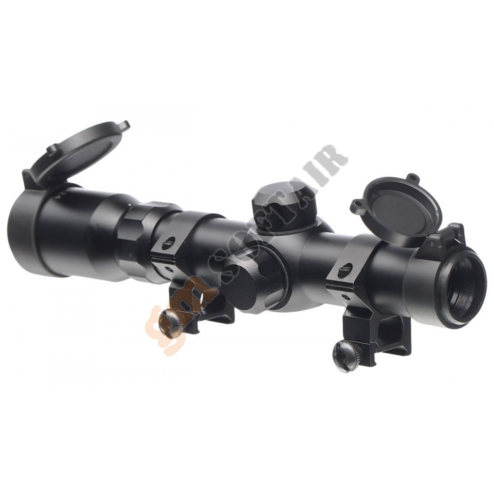 Ottica JS-Tactical. In alluminio, con alzo e deriva regolabili. Ingrandimento fisso 4x. Diametro lente 32 mm. Diametro tubo 25 mm. Compresa di anelli weaver.