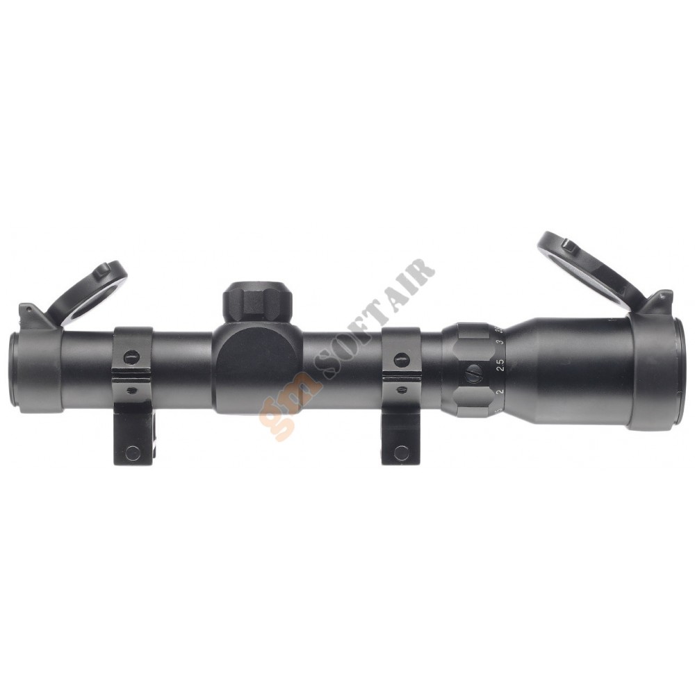 4X30 Compact Rubber Armored/Dual Ill NcStar. Diametro del tubo 30 mm. Diametro lente 30 mm. Zoom 4x. Alzo e deriva regolabili. Reticolo illuminato rosso/verde a 3 livelli di intensità. Compresa di protezioni lenti. Corpo in alluminio con rivestimento protettivo in gomma. Alimentata da 1 batteria CR2032 (non inclusa). Anelli compresi.