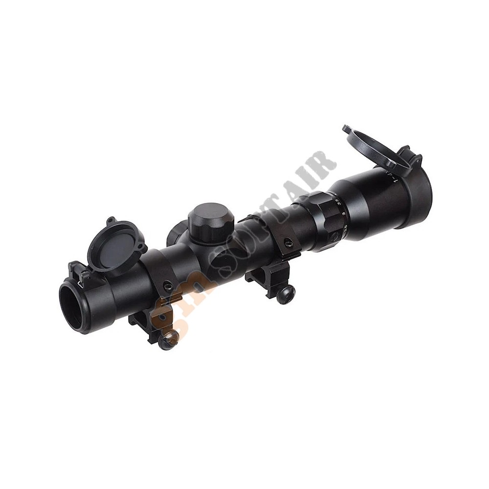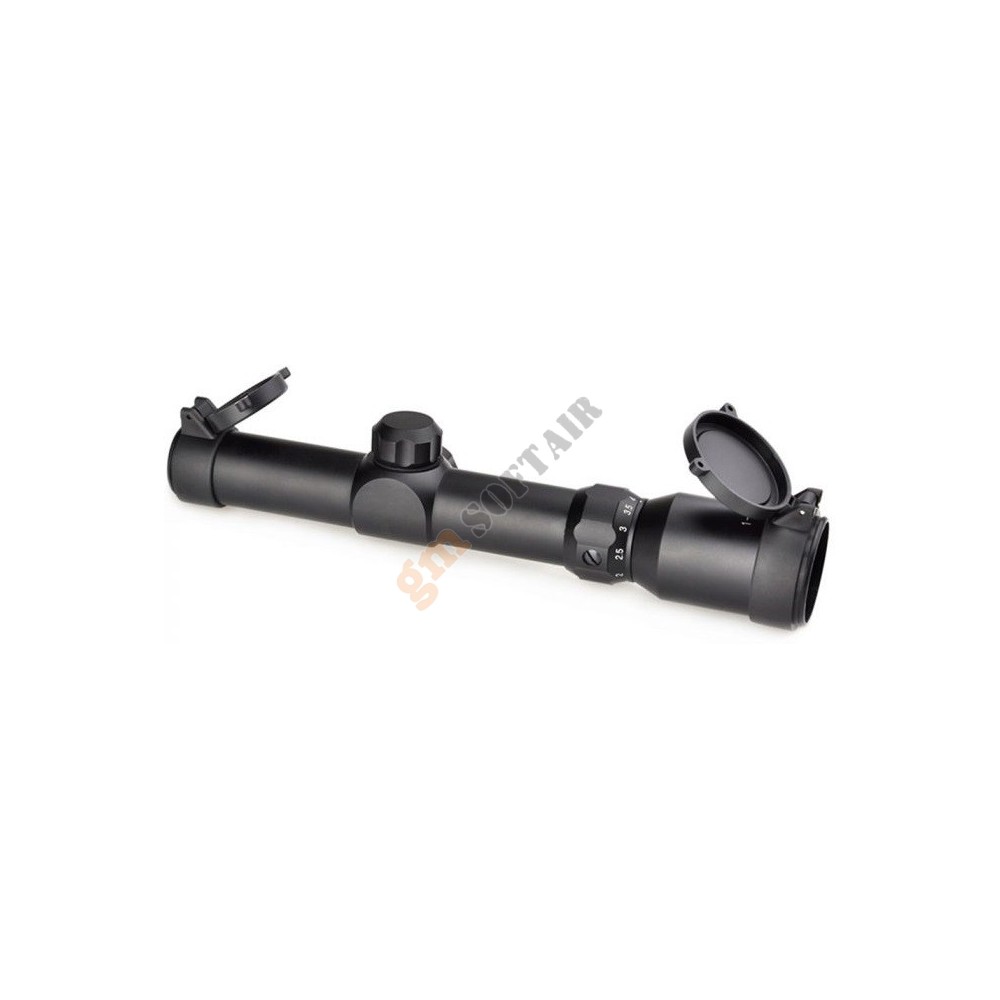 ECO MOD3 4X34 Scope Red & Blue Ill Nera NcStar. Corpo in alluminio anodizzato. Possibilità di installare le tacche di mira su 3 posizioni differenti. Aggancio rapido QD. Necessita di 1 batteria CR123A (non inclusa).