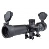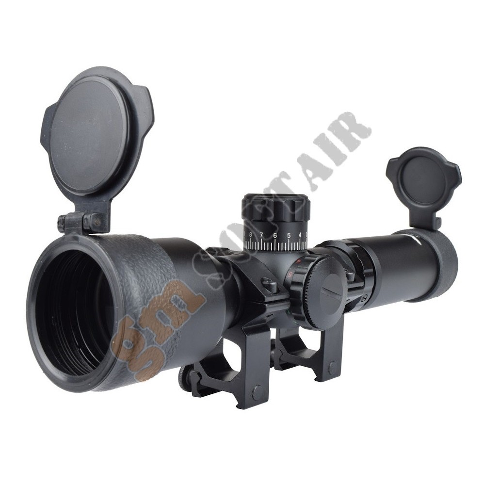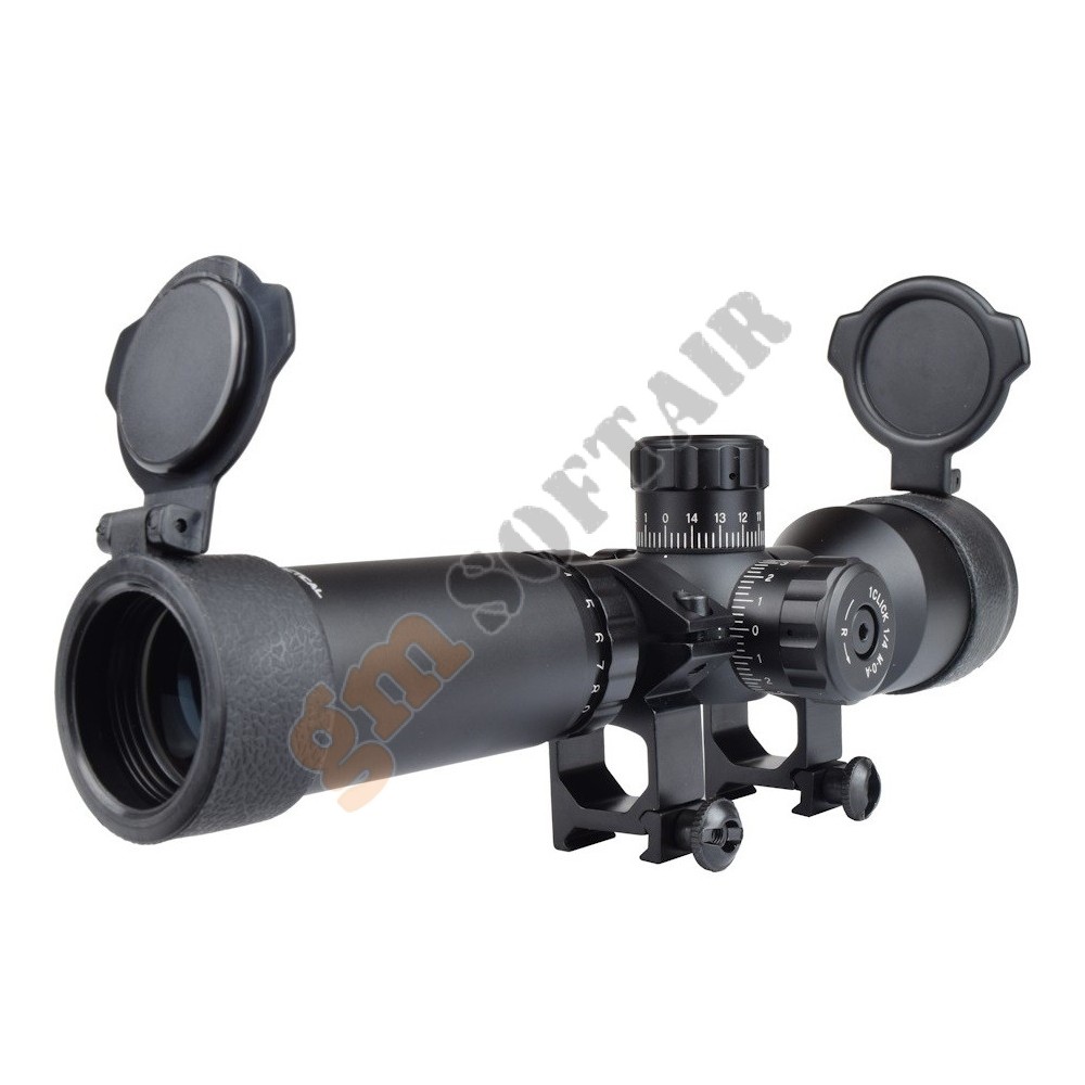 Ottica JS-Tactical. In alluminio, con alzo e deriva regolabili. Ingrandimento fisso 4x. Diametro lente 32 mm. Diametro tubo 25 mm. Compresa di anelli weaver.
