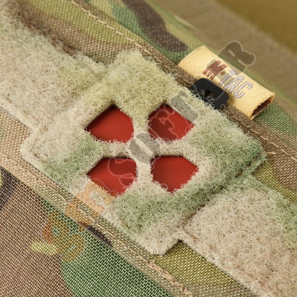 Il risvolto anteriore della tasca è dotato di un identificatore in due colori - tradizionali per i kit di pronto soccorso, rosso o nero, per rendere la tasca meno evidente.