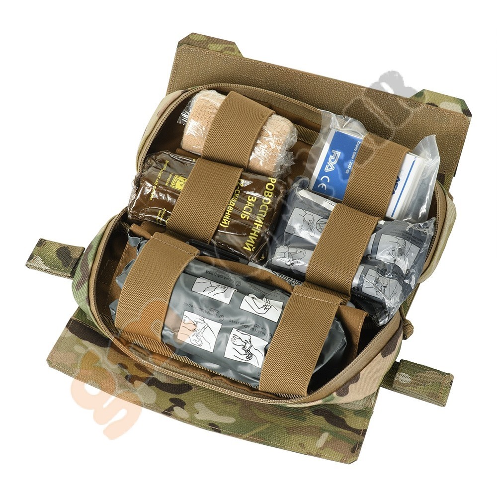 Questa tasca è composta da due parti: una copertura esterna, che è un elemento di fissaggio, e un kit di pronto soccorso per un IFAK (kit di pronto soccorso individuale).