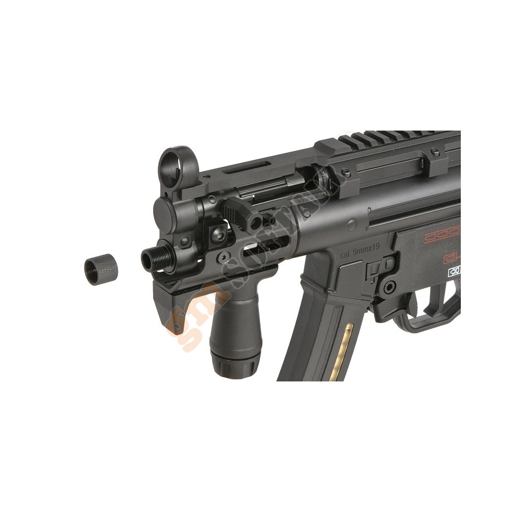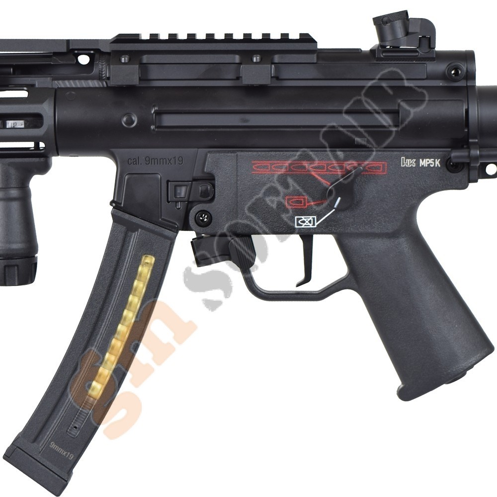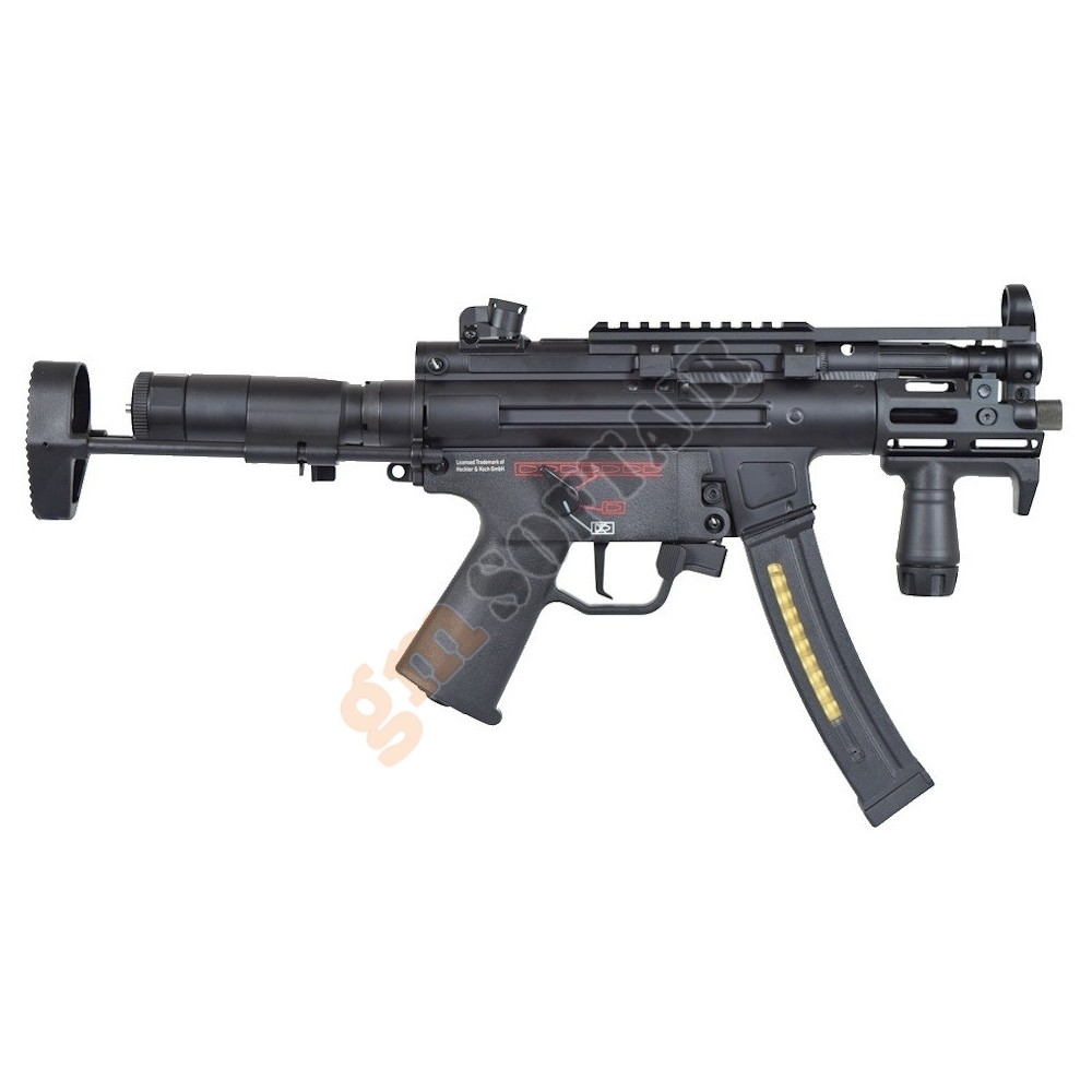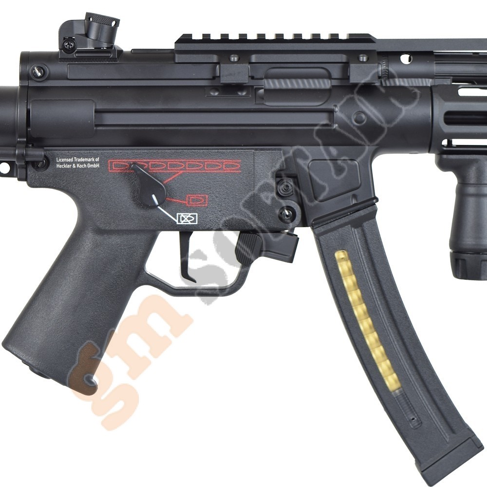 H&K MP5 A5 V2 TAC Umarex. Parte superiore del guscio in metallo, parte inferiore in polimero. Con loghi serigrafati. Modalità di tiro: colpo singolo, raffica controllata ( 3 colpi), raffica.Batteria e carica batteria esclusi.